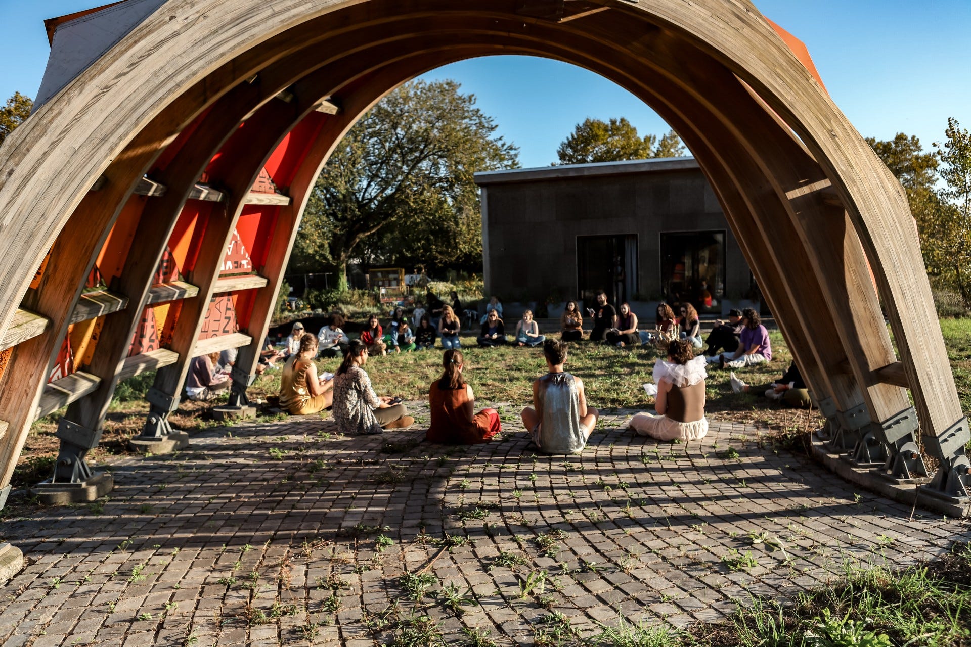 In that spirit, we’re honored to share “The Collective Womb,” artist Alexandra Neuman’s stunning, fresh feminist creation myth, in which the world begins and expands with pleasure and human beings descend from an ecstatic abortion. It was performed earlier this fall on Governor’s Island as well as last year. In it, the audience become members of a matriarchal society that revels in sensuality and the sentient earth. They come together to chant Neuman’s Psalms of Planetary Devotion, featured on The Myth Lab this summer, a ritual opening to a larger performance in which the setting of the natural world becomes character and core. A friend of mine, visiting from Texas, where abortion has been banned since 2022, said how bold and fresh, even a little dangerous, the myth felt. It’s a story that needs to be performed and retold again and again in the years ahead.